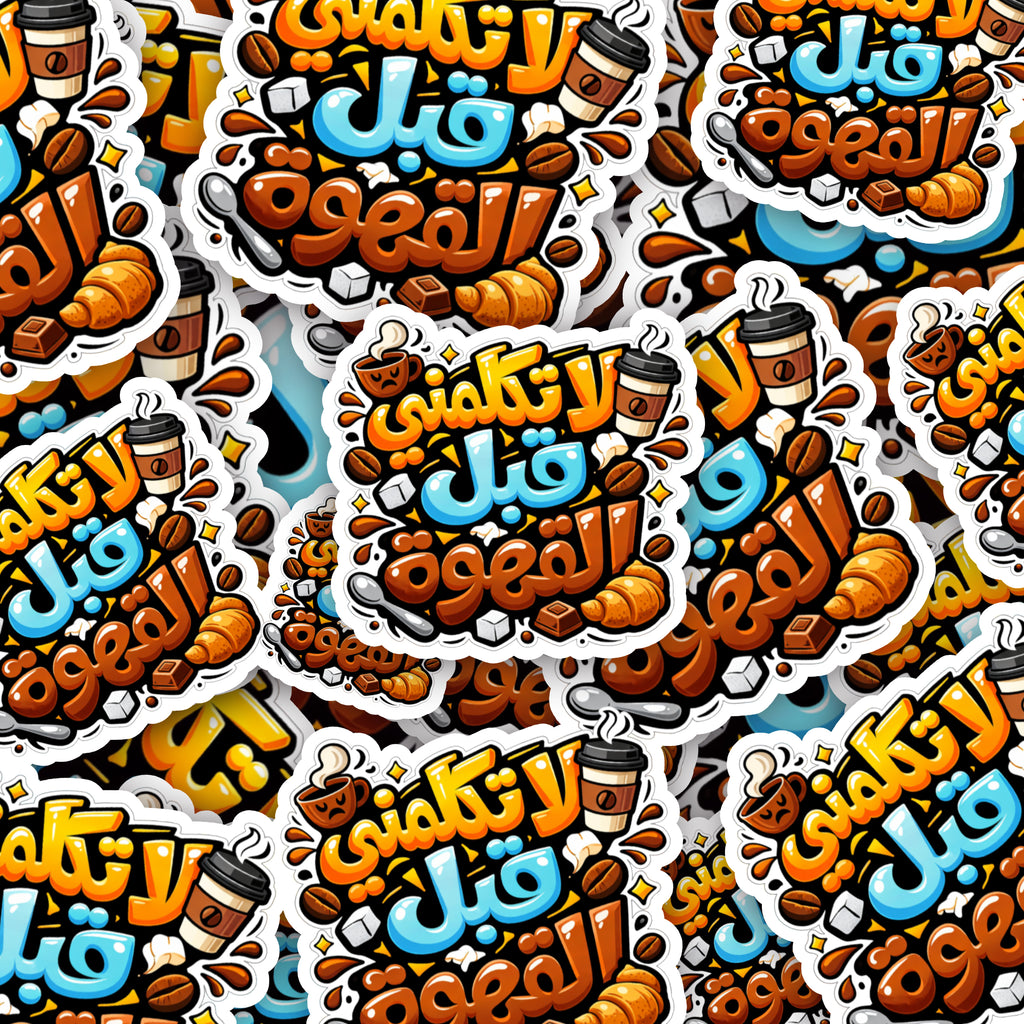 Sticker sheet featuring the Arabic phrase "لا تكلمني قبل القهوة" (Don't talk to me before coffee) in elegant calligraphy. Personalize your everyday items—laptop, phone, water bottle, or journal—with this humorous and culturally authentic design. High-quality stickers that are easy to apply and built to last. Perfect for coffee lovers who appreciate multilingual wit and authentic Arabic messaging.